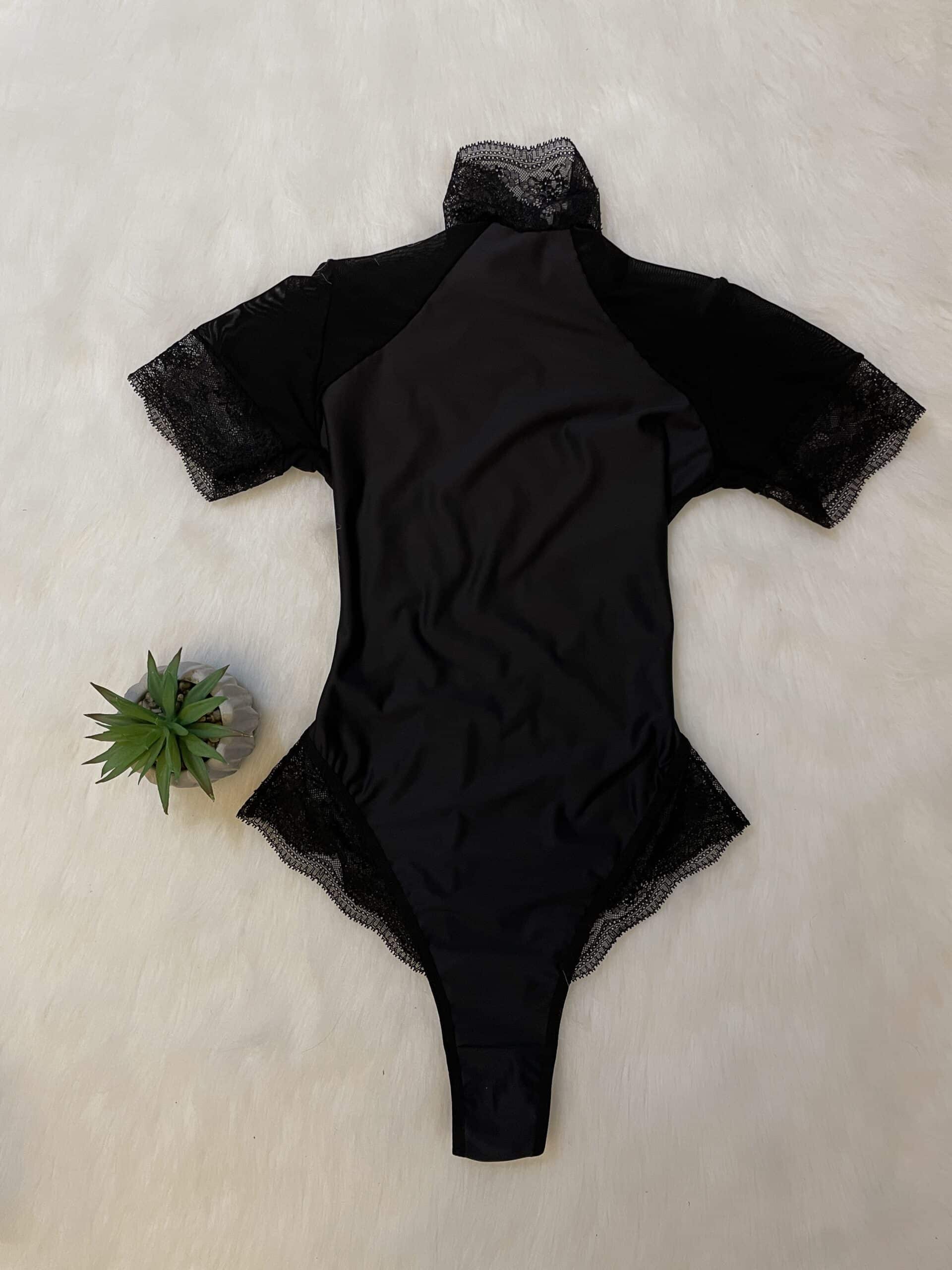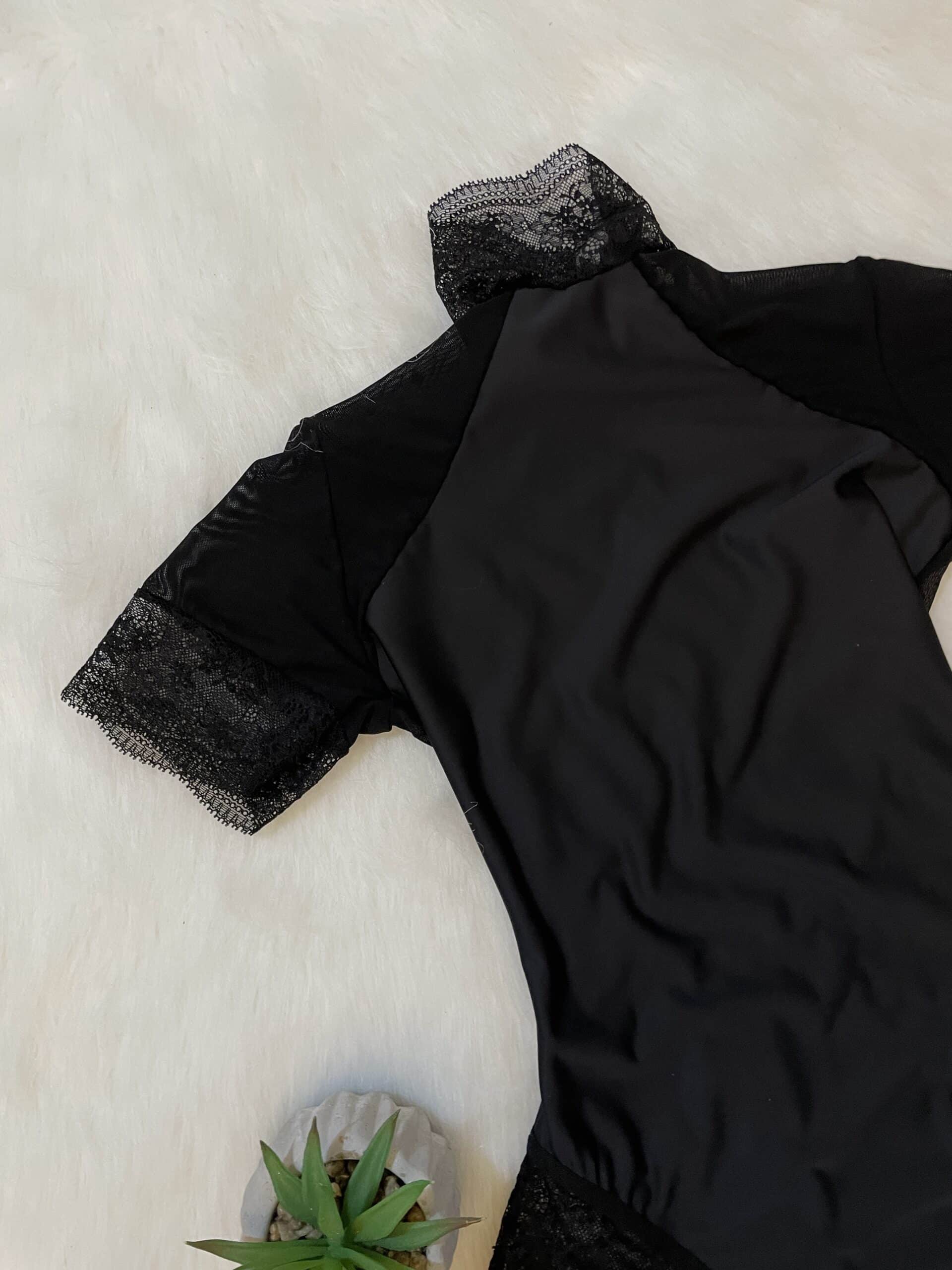 Body entallado de lycra color negro con detalles en microtul y encaje. Con cuello alto y espalda descubierta infartante. Ideal para salir.
