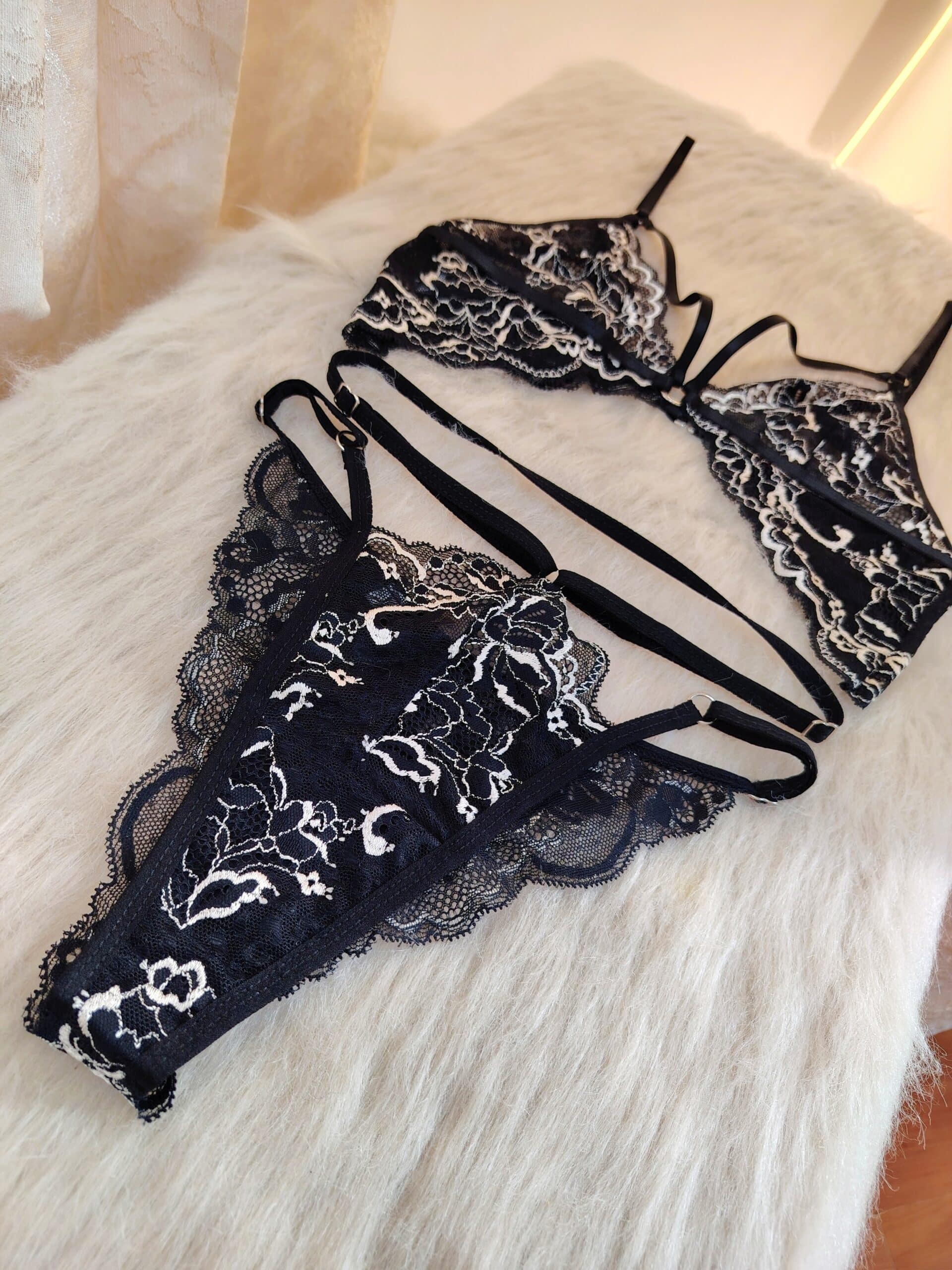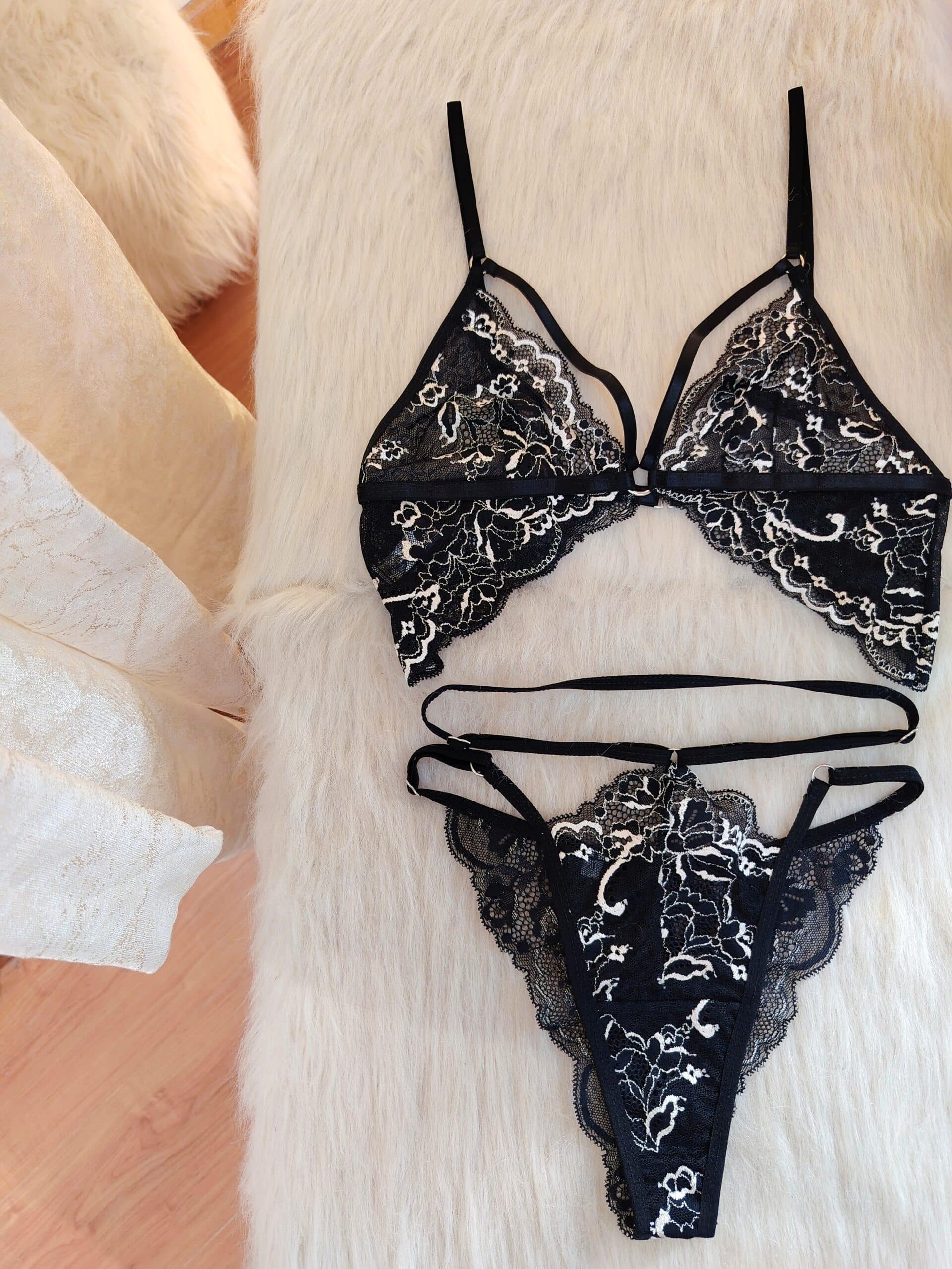 Conjunto Geminis, nuevo encaje bitono de elegancia dual. Encaje negro con delicados detalles en color hueso.