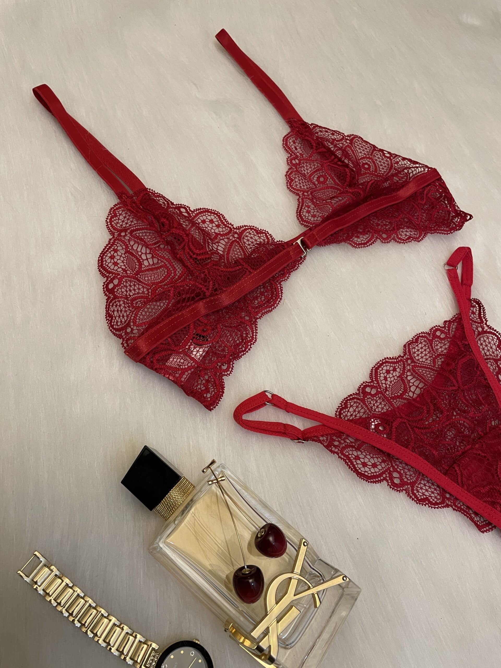Conjunto Terra de encaje rojo oscuro y tanga regulable. Encaje suave y elastizado con broche de gancho delantero y breteles regulables.