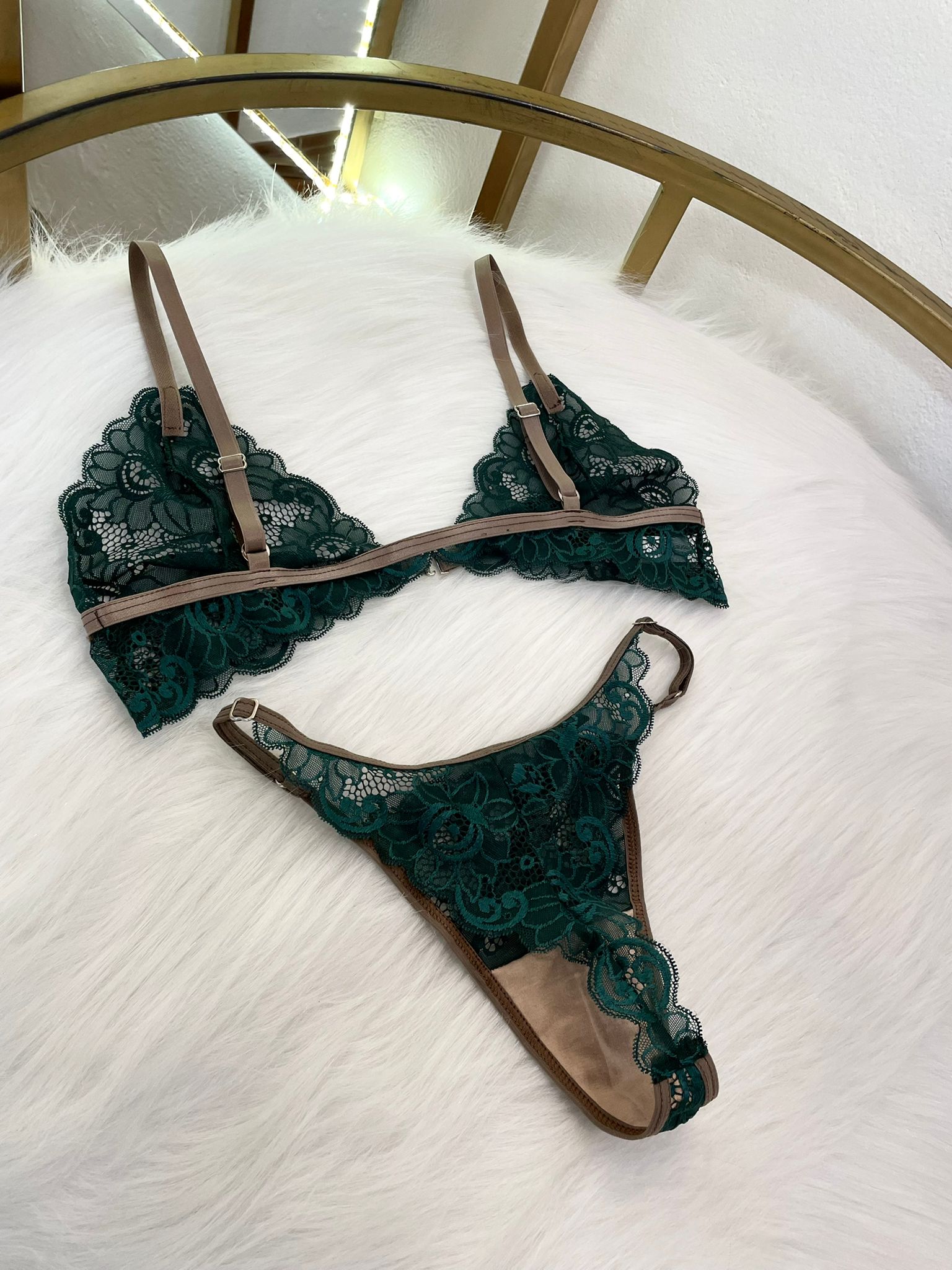 Conjunto Terra de encaje verde esmeralda oscuro y tanga regulable. Encaje suave y elastizado con broche de gancho delantero y breteles regulables.