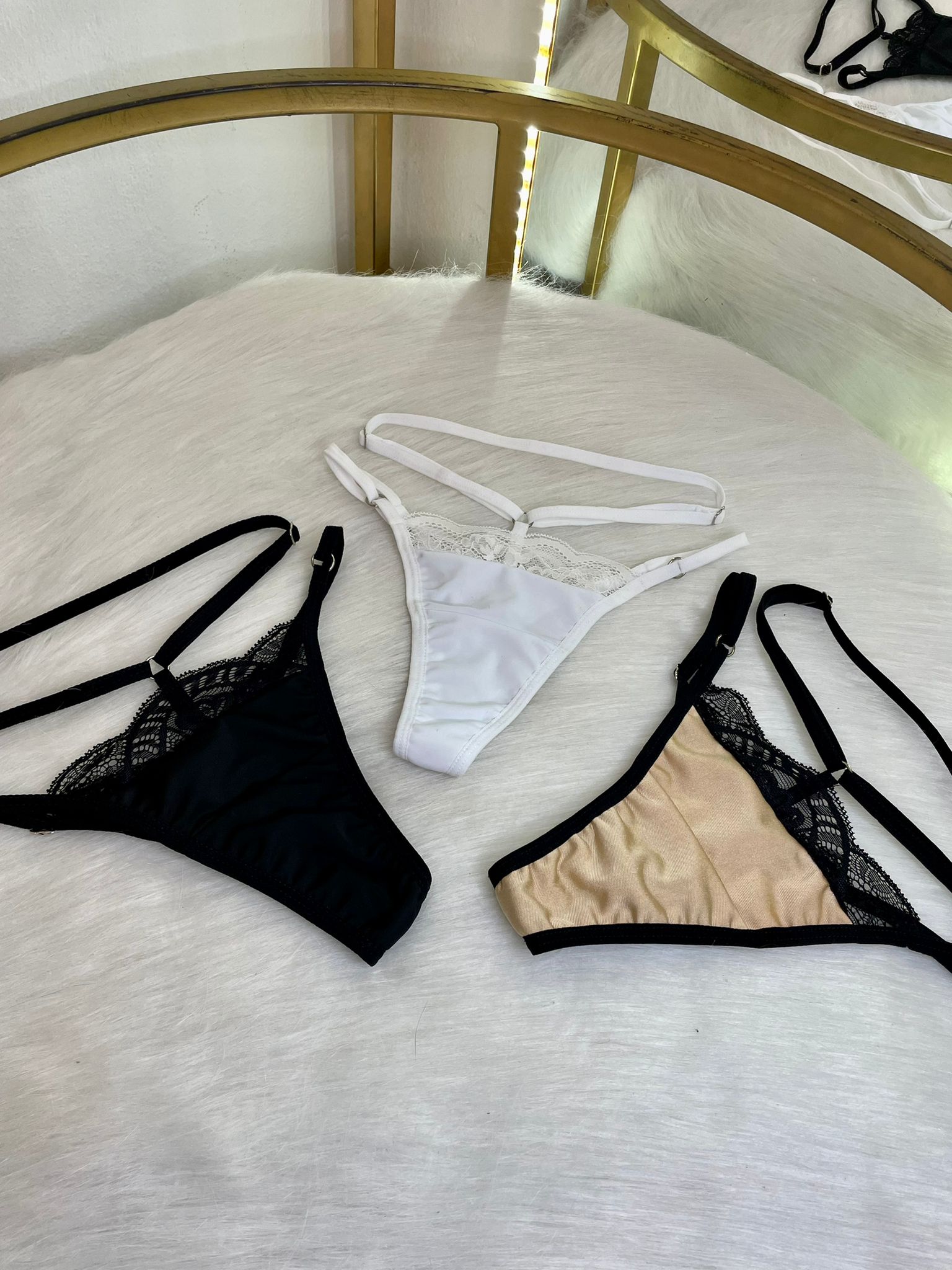 Pack solo por encargo de 3 tangas Gaia de encaje y lycra, colores variados a elección, con regulación. Para talle S y M elegir talle 1, para talle L y XL elegir talle 2.