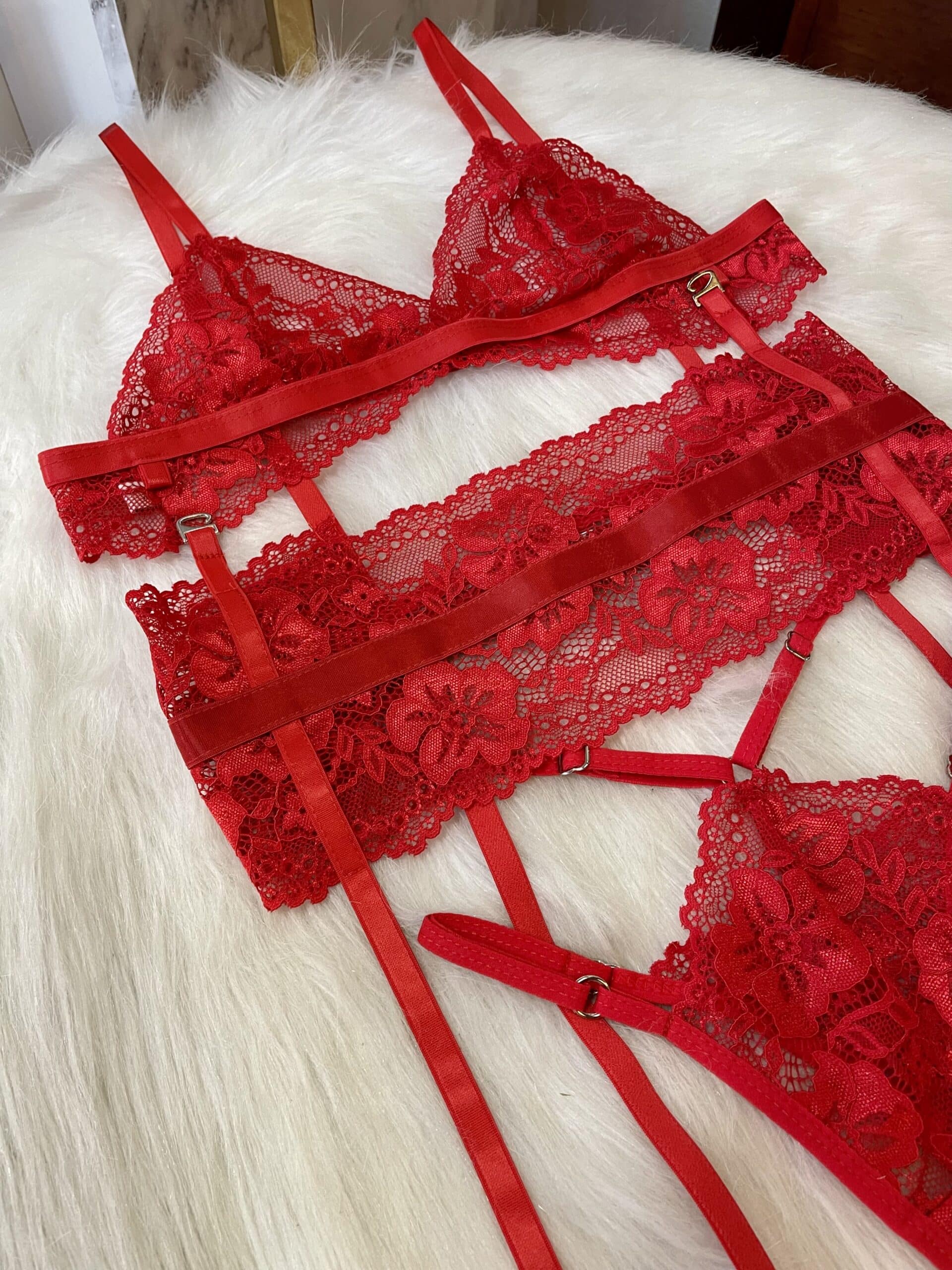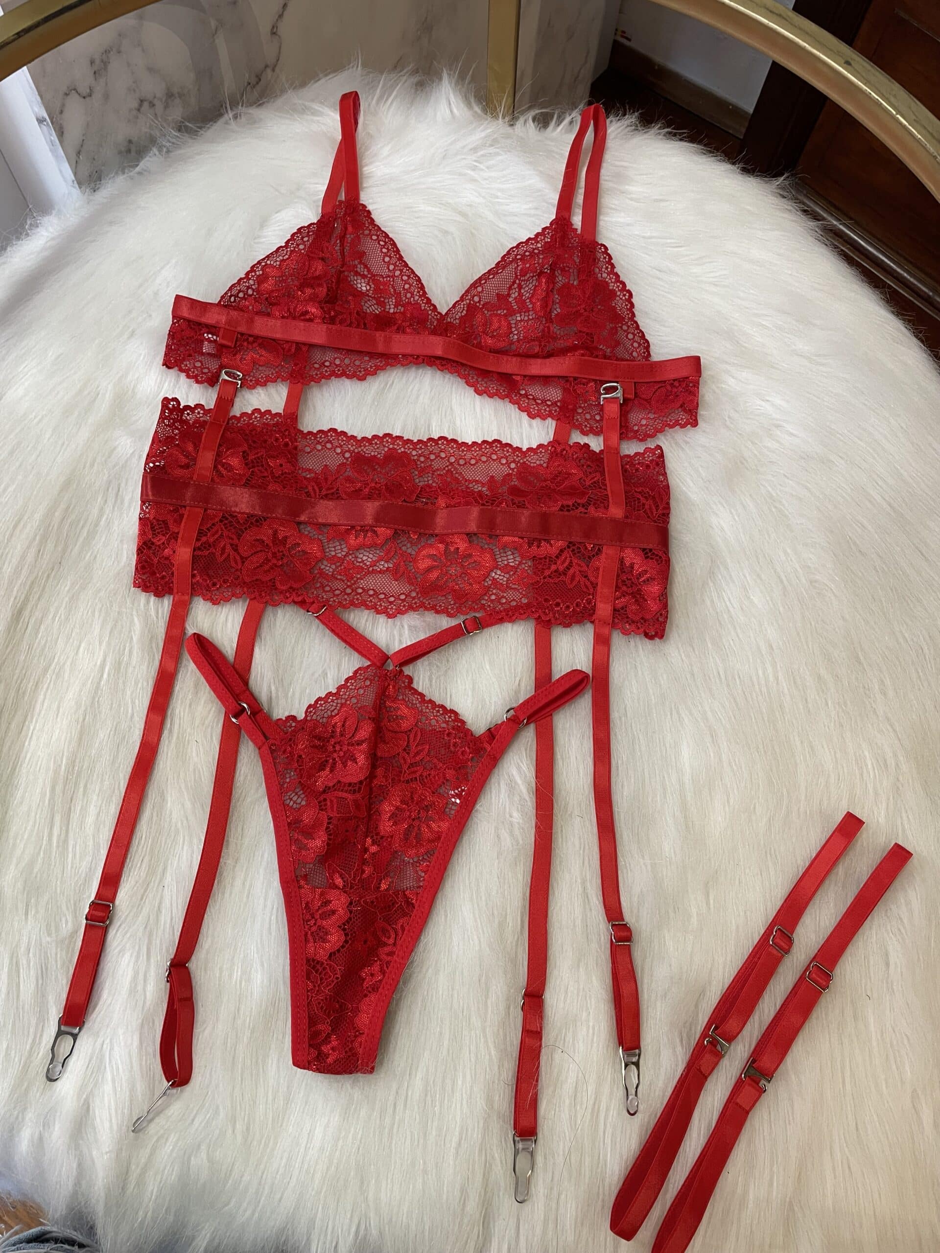 Set Gia de 4 piezas, conjunto de bralette con tanga de tira doble a la cintura regulable, portaligas con enganches desmontable para formar una pieza unica y ligas regulables que remplazan las medias.